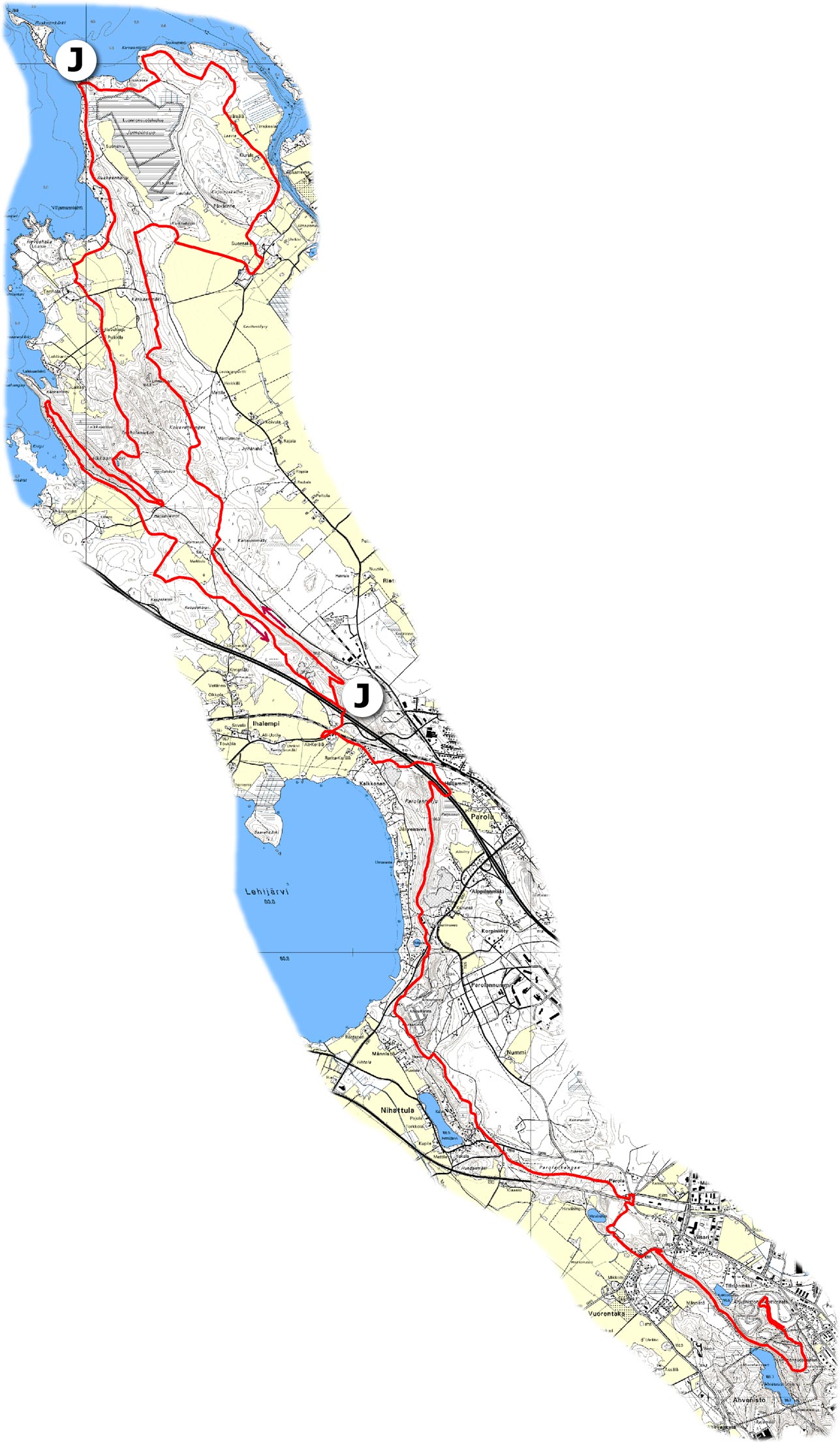 Kilpailureitti kulkee pääosin Ahveniston ja Parolan harjuilla melko kuivassa kangasmaastossa. Kilpailureitin kokonaispituus on n. 85 km ja